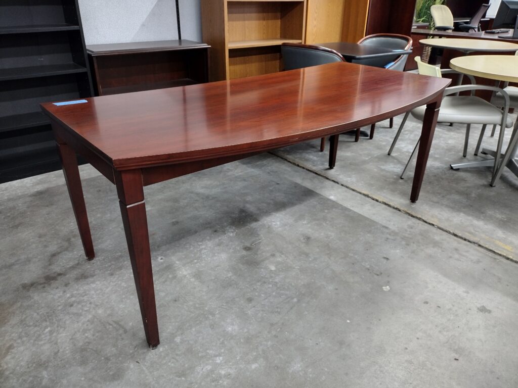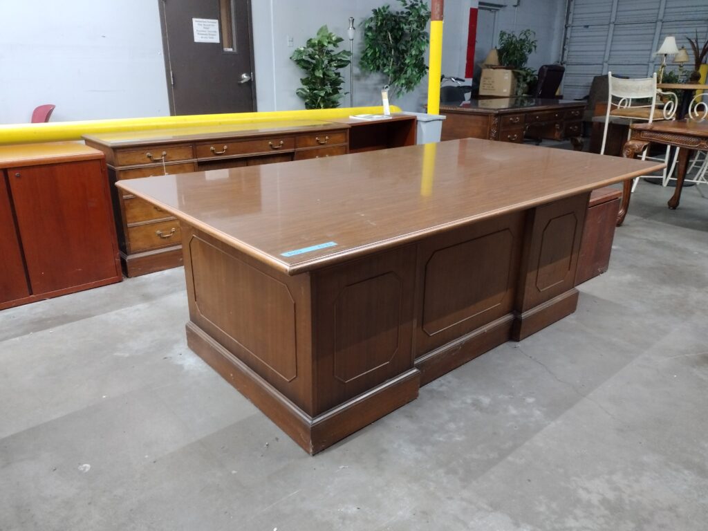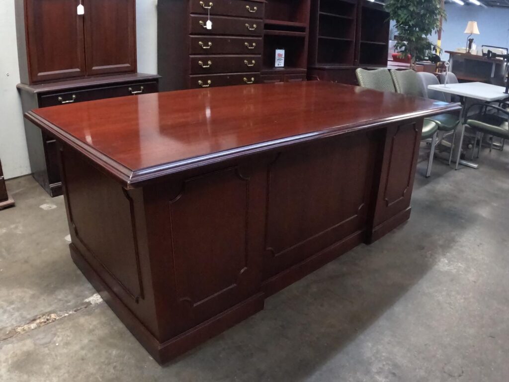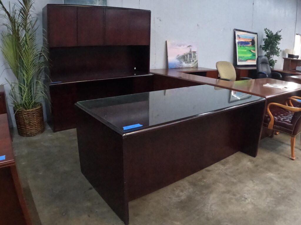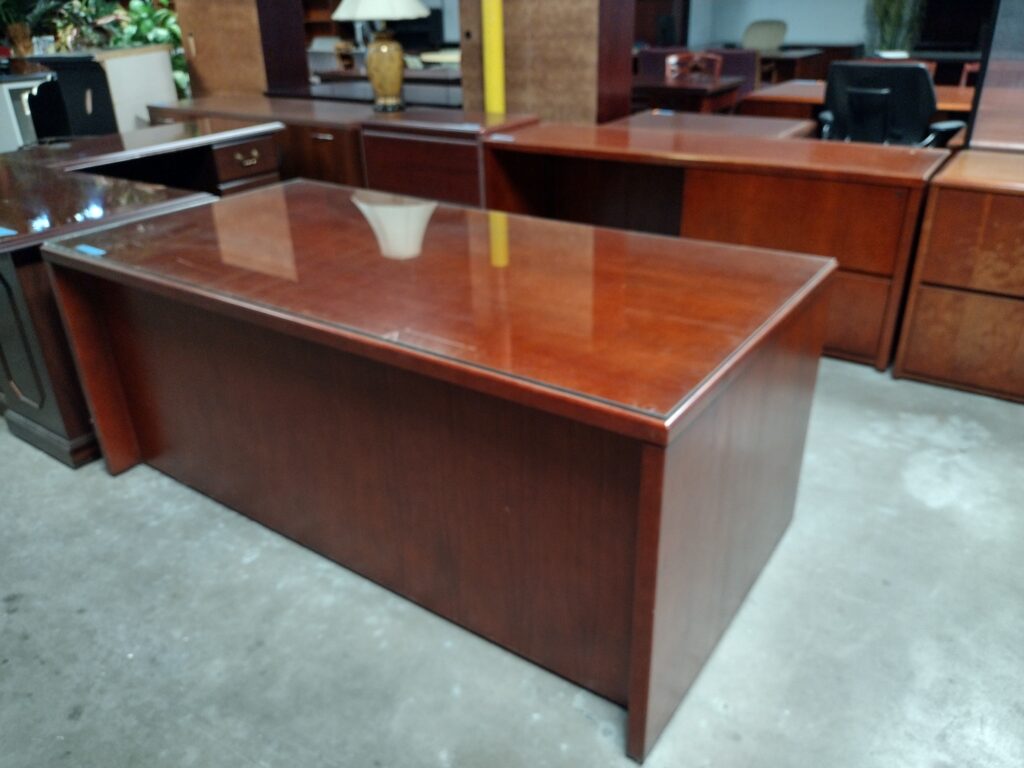 Dark Mahogany Wood Veneer Executive Desk with Glass Top