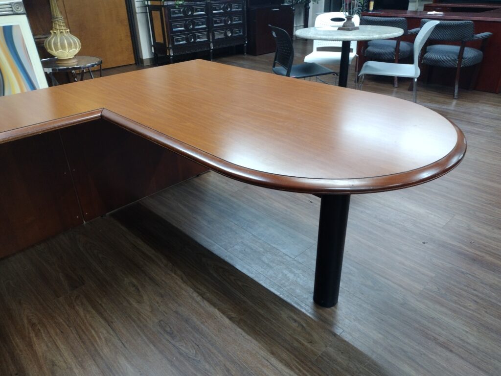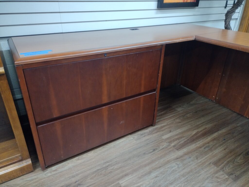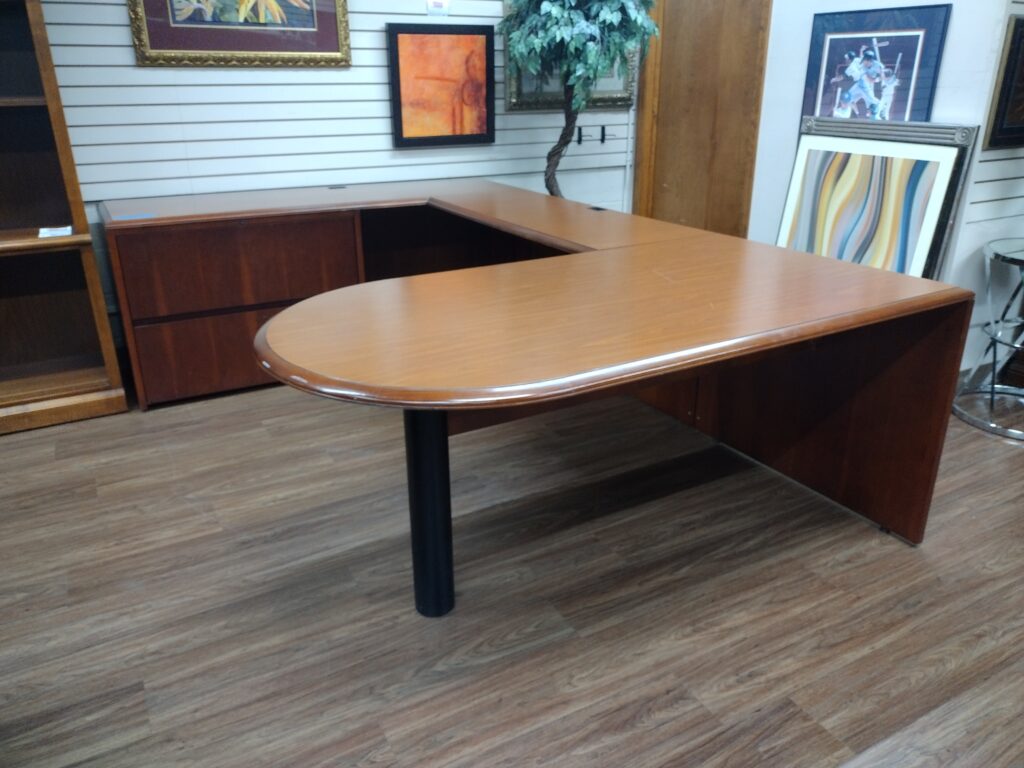 Cherry Wood Veneer U-Desk with Bullet Top. This desk features a two drawer lateral file cabinet. Dimensions below. Availability is subject to change.