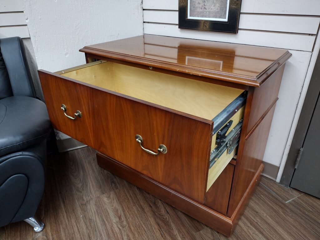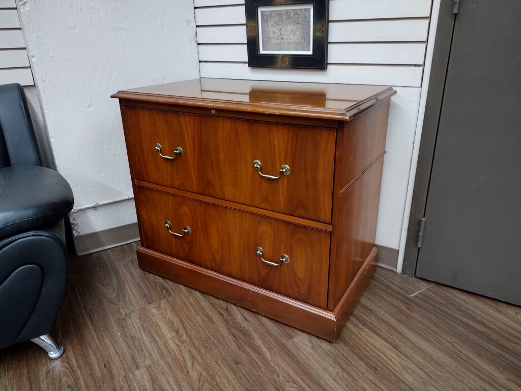 Honey Oak Wood Veneer Two Drawer Lateral File Cabinet. This piece really is like new and higher quality. It could also be seen as a Light Cherry. Availability is subject to change.