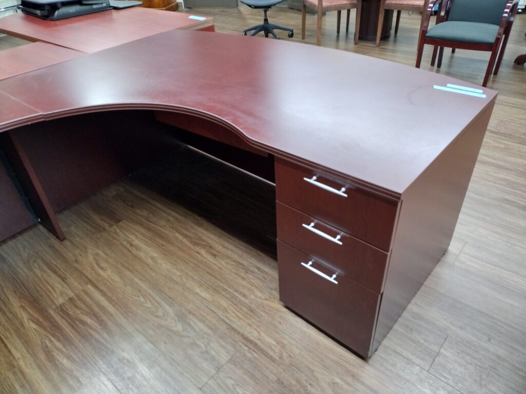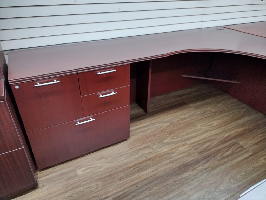 Mahogany Bow Front U-Desk with Extensions / Curved Corners. Features a Deluxe Box / Box / File Pedestal of Drawers and a Combination File Cabinet. Availability is subject to change.