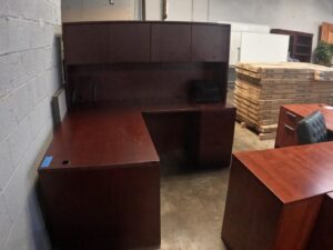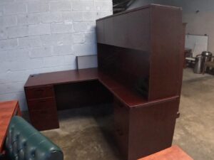 Mahogany L-Desk with Double Deluxe Pedestals and Hutch. Hutch includes two sets of laminate doors.