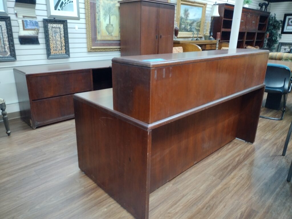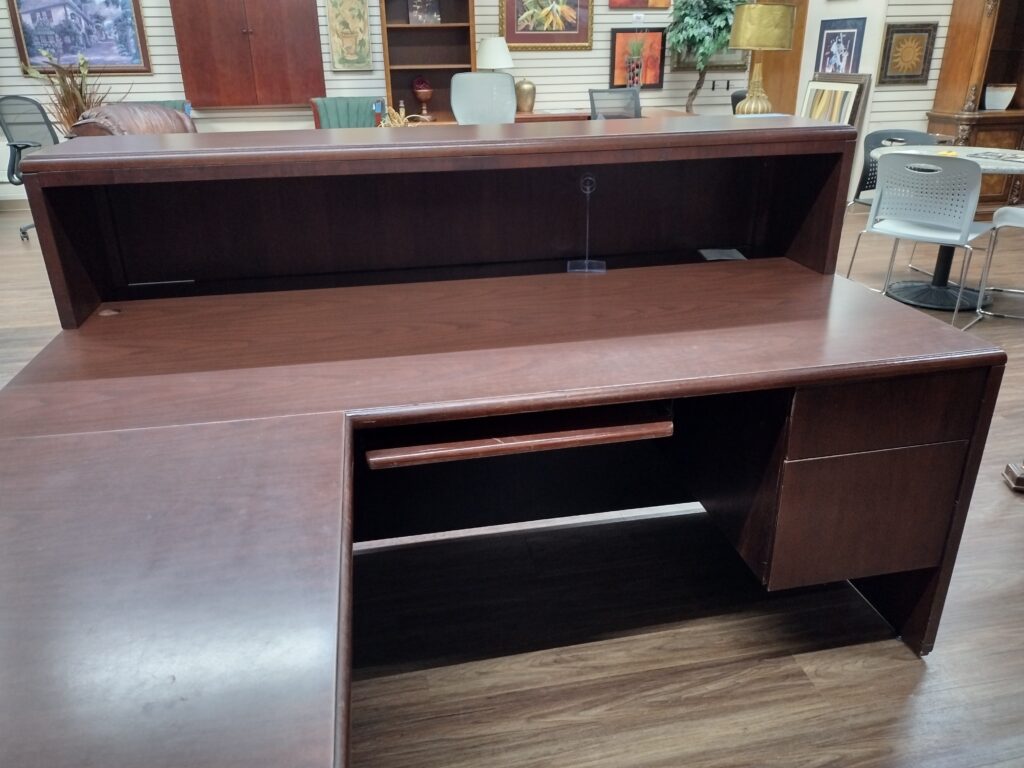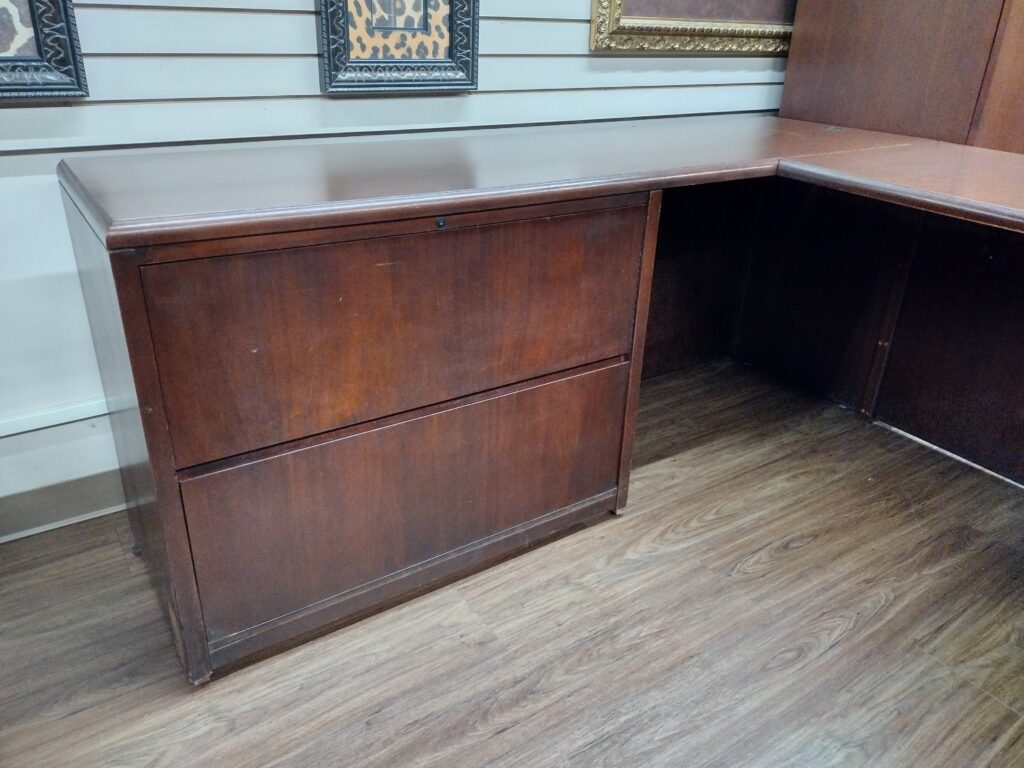 Mahogany Wood Veneer Reception Desk. Features a Transaction Top and Two Drawer Lateral File Cabinet for File Storage, Suspended Box / File Pedestal, and Wood Veneer Keyboard Tray. Availability is subject to change.