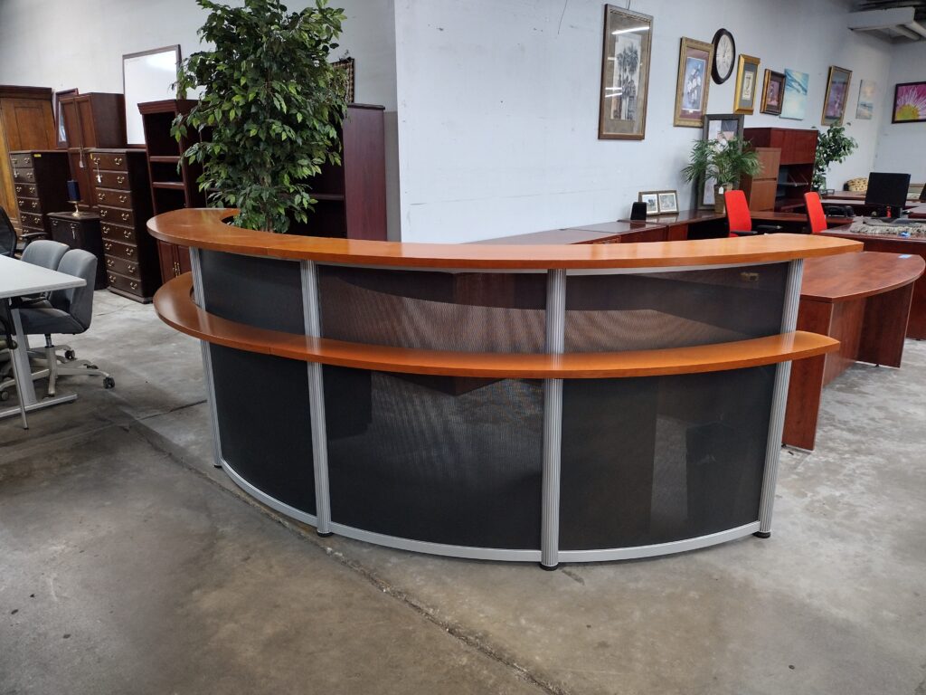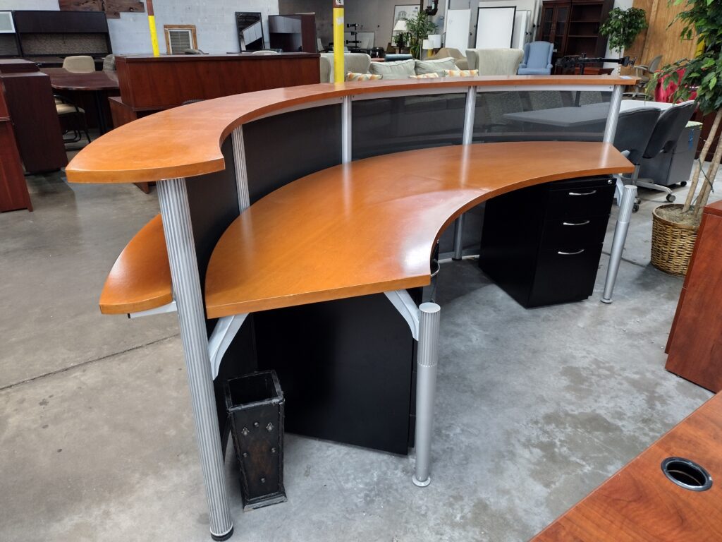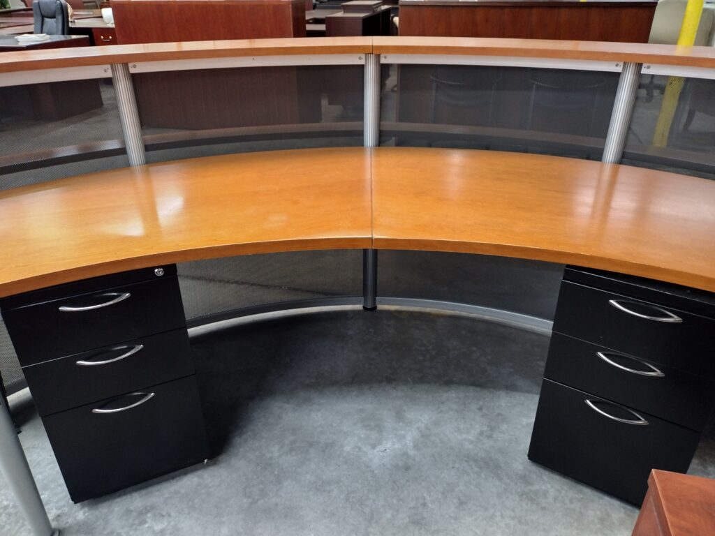 Oversized Black / Cherry Curved Reception Desk – Heavy Duty / Commercial Grade – Includes the two black pedestals pictured. Availability is subject to change.