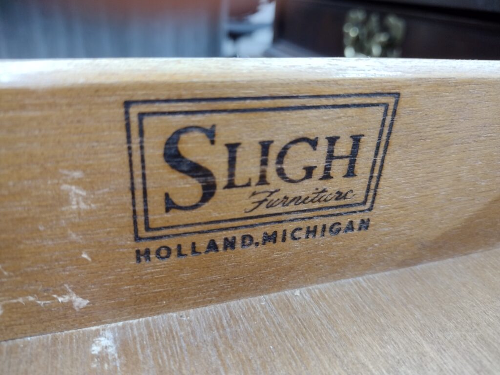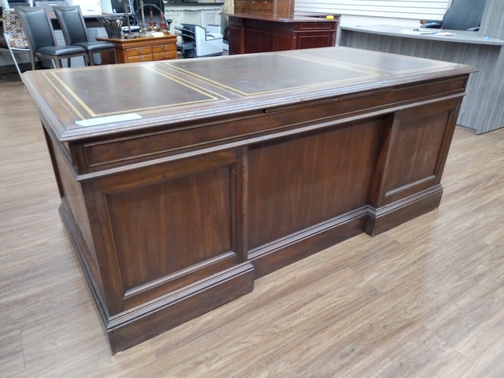 SLIGH 6′ Executive Double Deluxe Pedestal Desk with Leather Inlay. Features 24 carat gold leaf tooling in the leather inlay. This desk was over $5000 new. Availability is subject to change.