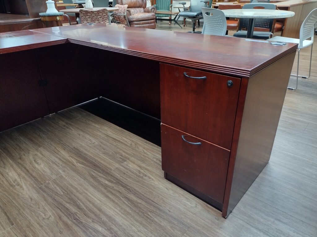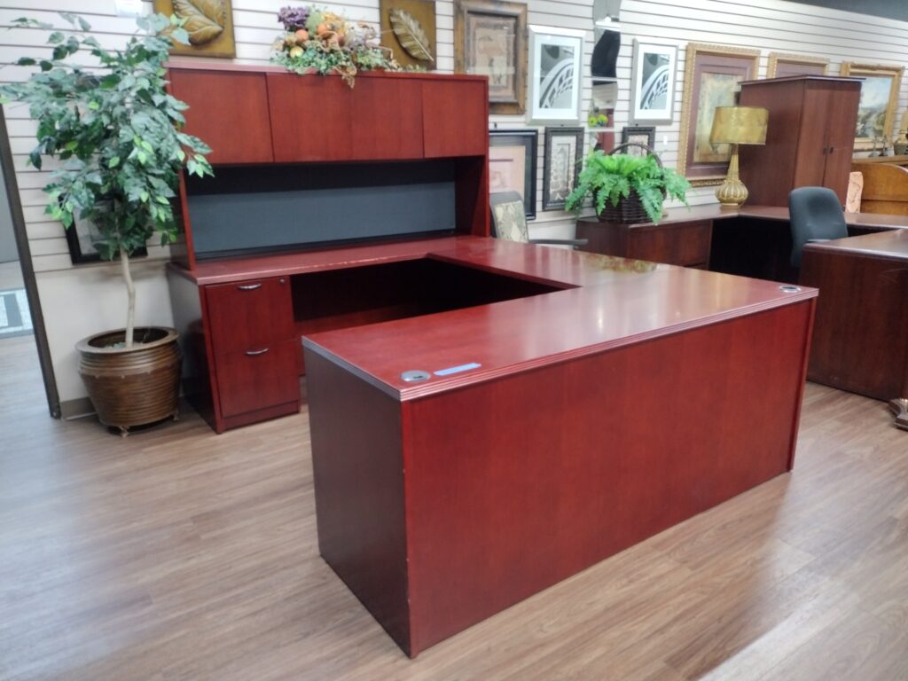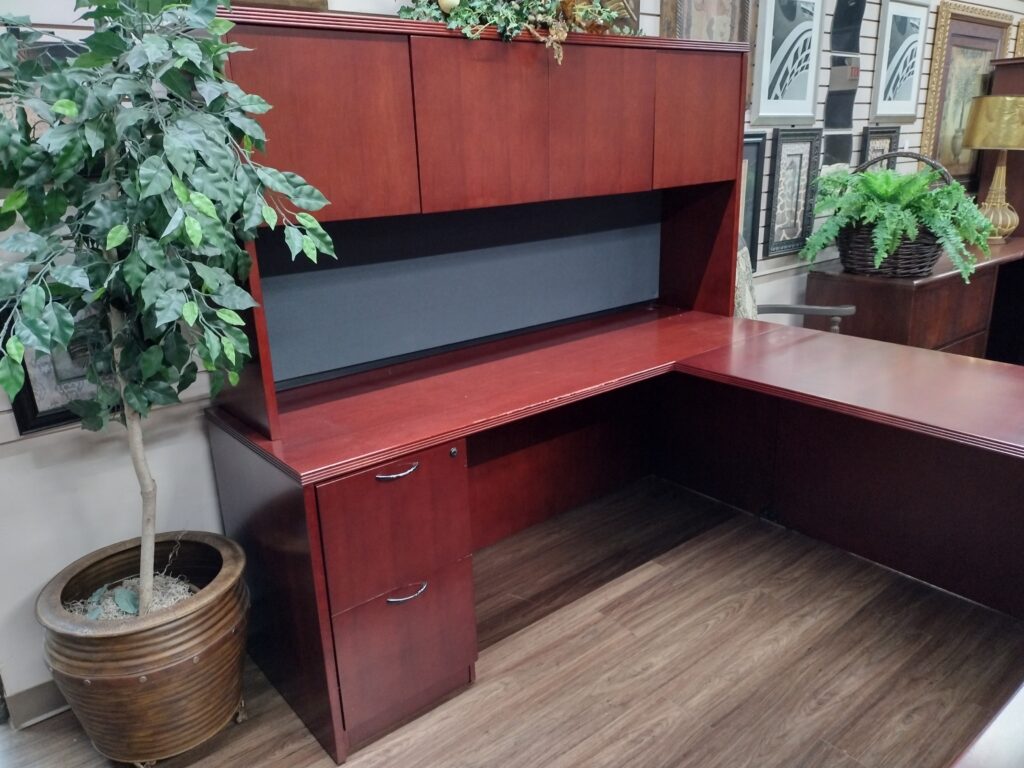 Smaller Mahogany Wood Veneer U-Desk with Hutch. Features Double Deluxe Pedestals and Tack Board on the Hutch. The bridge can be shortened to make the desk less deep for smaller offices. Availability is subject to change.