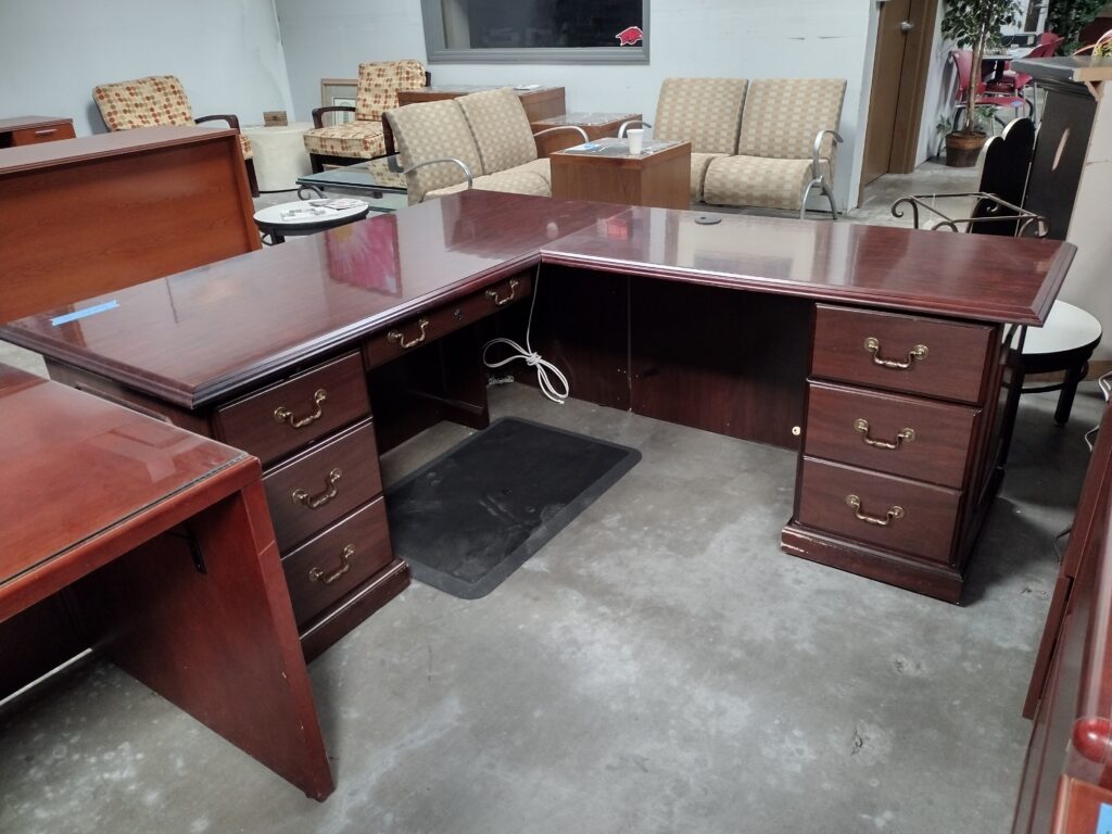 Traditional Style Mahogany Wood Veneer L-Desk – Right Return – Features Double Deluxe Pedestals. Availability is subject to change.